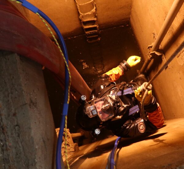 Potápěč byl spuštěn do jímky č. 1 pomocí trojnožky. Ponořil se do hloubky pěti metrů, kde ho čekaly extrémně ztížené podmínky – viditelnost dosahovala maximálně 0,5 metru, po zvíření sedimentu byla dokonce nulová. Na přilbě měl kameru pro záznam průběhu zásahu a byl jištěn lanem. Během ponoru zkontroloval stav ovládací tyče a klapy DN1200. Zatímco technický stav byl v pořádku, na dně jímky se nacházel nános o výšce přibližně 60 cm, který znemožňoval další práci.