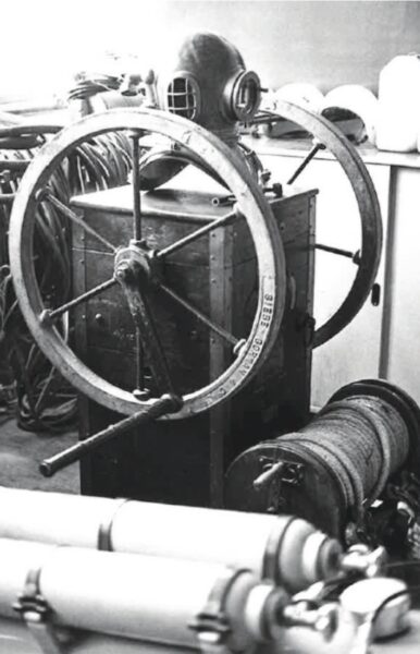 Na přední straně krytu se nacházely dva výstupy, ke kterým se připojovaly hadice a dodávaly vzduch potápěčům. Pod víkem krytu se nacházela páka, kterou bylo umožněno nastavit pumpu tak, aby vzduch mohl používat jeden nebo dva potápěči. Jeden výstup byl označen jako „hluboká voda“, zatímco druhý výstup byl označen jako „běžná hloubka“. Vzduchová puma byla vybaveno dvěma Bourdonovými trubicemi (manometry), které monitorovaly libry tlaku (od 0 do 100 liber) a stopy slané vody (od 0 do 226 stop). K této vzduchové pumpě se používal standardní potápěčský oblek, který se skládal z nepromokavého obleku a vzduchotěsné přilby, připojené hadicí ke vzduchové pumpě. Potápěč nosil pod oblekem vrstvy vlněného oblečení, palčáky a boty vážící až 7 kg. Těžká měděná přilba se skleněnými zorníky byla našroubována na náplecník, který byl nasazen na těsnicí přírubu obleku. Na zádech a hrudi potápěče bylo nasazeno až 50 kg závaží. K opasku potápěče byl připevněn nůž, pochva a lano, které sloužilo k vysílání signálů posádce před použitím radiokomunikačního zařízení. Vzduch byl potápěči pumpován ručně muži otáčejícími dvěma velkými koly. Celé toto vybavení mělo problémy, protože potápěči nemohli regulovat průtok vzduchu a jeho množství bylo díky průtoku ochuzené.
